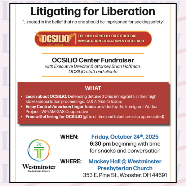 Event of Interest: Litigating for Liberation with OCSILiO Friday, October 24, 6:30 pm, at Westminster Presbyterian Church Mackey Hall Learn more about OCSILiO's mission in action in defending detained Ohio […]